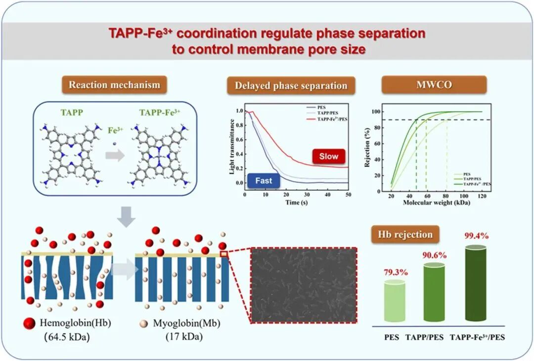 研究提出了一种基于TAPP-Fe³⁺配位调控相分离策略,制备出可精准筛分血红蛋白(Hb)与肌红蛋白(Mb)的功能化超滤膜,为生物医用分离、蛋白纯化提供全新技术路线。Hb(64.5 kDa)与Mb(17.5 kDa)是临床与生物制药领域的重要分离目标蛋白,但二者分子性质高度相似,且分子量均处于超滤临界区间(10–100 kDa),常规膜材料难以实现精准筛分,非特异性吸附严重、孔径分布不均是行业共性难题。